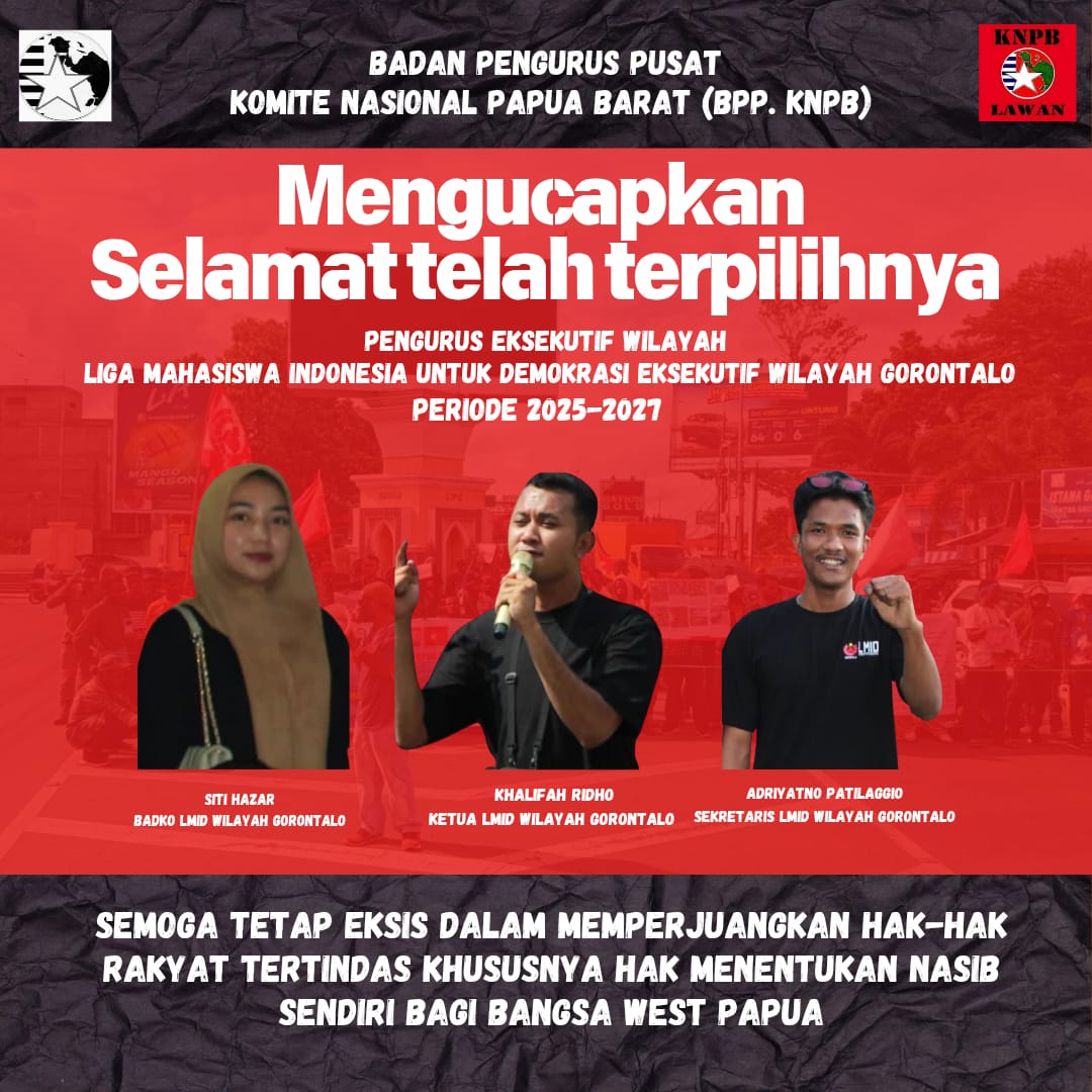 “Secara resmi KNPB mengucapkan selamat atas terpilihnya Pengurus exsecutif wilayah, Liga Mahasiswa Indonesia Untuk Demokrasi Eksecutif Wilayah Gorontalo Periode 2025 – 2027,”katanya.