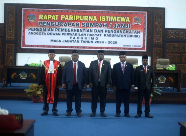 Dekai, tiiruu.com – Pemerintah kabupaten Yahukimo telah mengumumkan dalam pelantikan 35 anggota Dewan Perwakilan Rakyat kabupaten (DPRK) Yahukimo Periode 2024-2029, bahwa Son Bahabol.S.IP Sebagai ketua DPRD antar Waktu dan Amirson Heselo sebagai Wakil ketua antar waktu. Pengumuman itu dibacakan oleh Kepala Sekertariat Dewan (Sekwan) Nelson Bahabol S.Sos.M.Si.