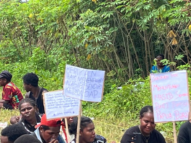 “ Berikan hak menentukan nasib sendiri kepada OAP,” begini tulisan yang dibentangkan dalam pampflet oleh massa aksi di Wadio, samping Adamant Hotel Nabire, Selasa, (7/4/2026).