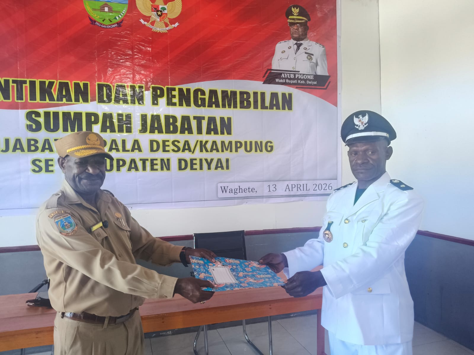Deiyai, tiiruu.com – Pemerintah Kabupaten Deiyai resmi melantik dan mengambil sumpah jabatan Penjabat (PJ) Kepala Kampung Widimei, Distrik Tigi Barat, pada Senin, 13 April 2026. Kegiatan tersebut berlangsung di Aula Dinas Pemberdayaan Masyarakat dan Kampung (DPMK) Kabupaten Deiyai.